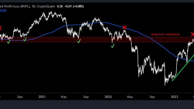 In the above graph, the quant has marked the “long-term resistance” zone that the Bitcoin NUPL has seemed to have historically followed. This area, which lies in between the values of 0.31 and 0.38, has been an important retest for the cryptocurrency, as failure here has often meant the start of a drawdown.